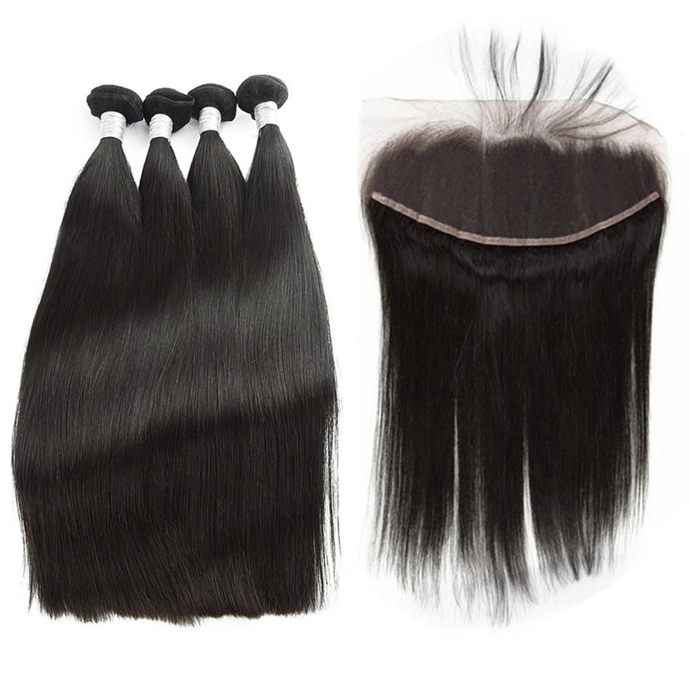 Wolf king straight wave 4 bundles with 13*4 HD transparent frontal natural color virgin human hair weft