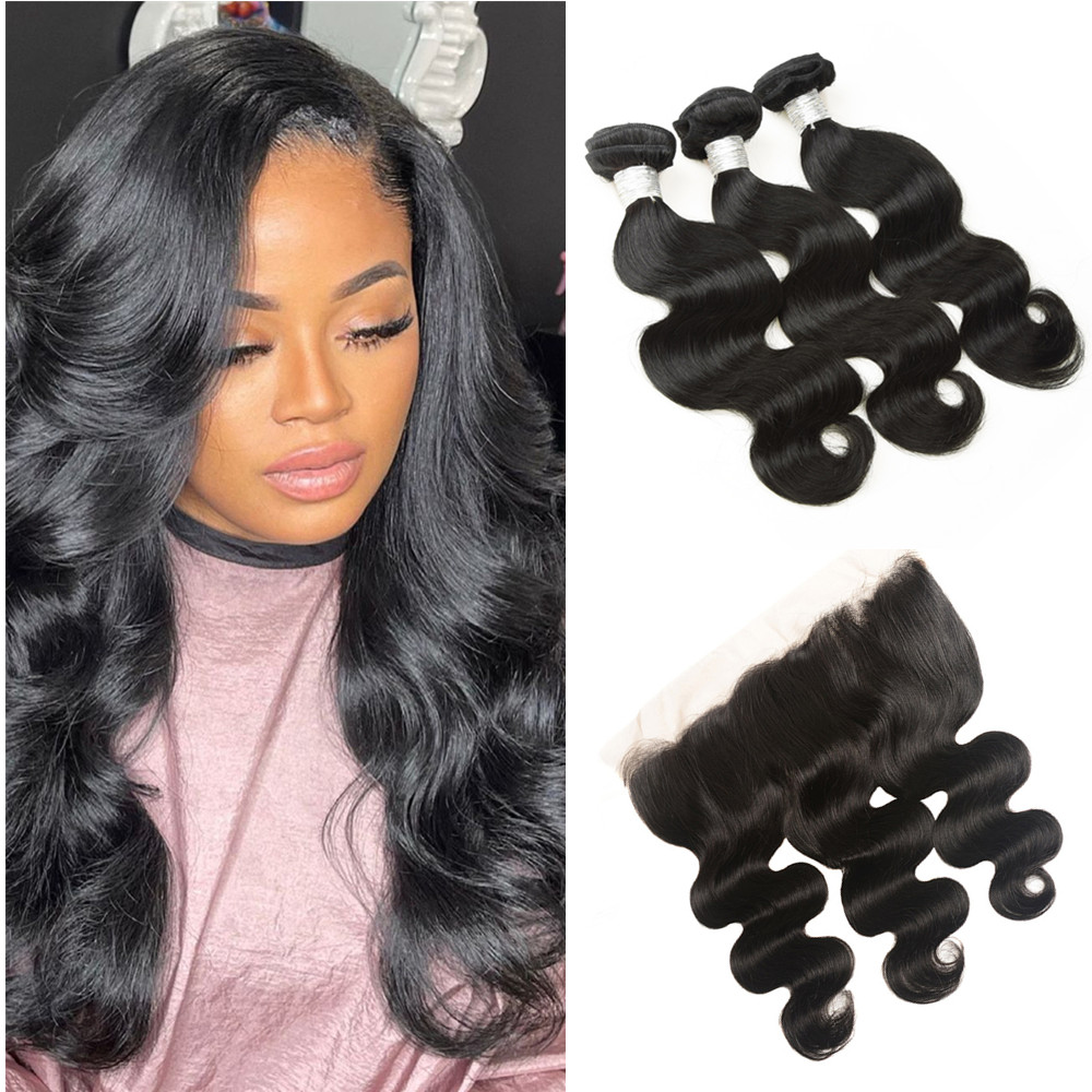 Wolf king body wave 3 bundles with 13*4 HD transparent frontal natural color virgin human hair weft