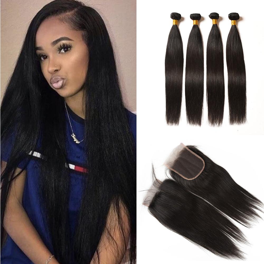 Wolf king straight wave 4 bundles with 4*4 HD transparent closure natural color 100% human hair