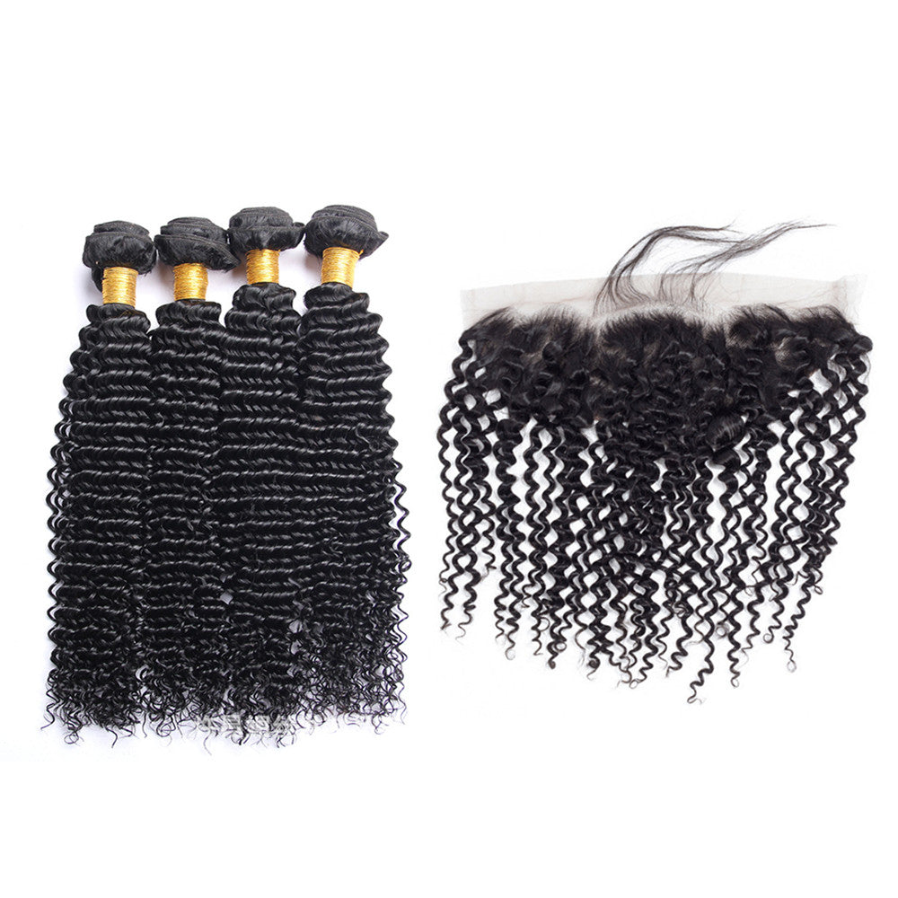 Wolf king kinky curly 4 bundles with 13*6 HD transparent frontal natural color virgin human hair weft