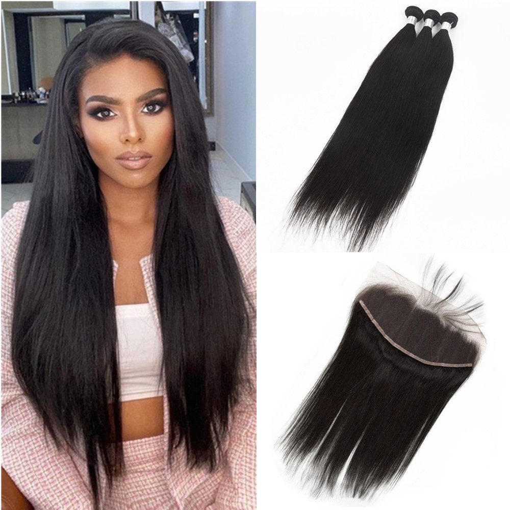 Wolf king straight 3 bundles with 13*4 HD transparent frontal natural color 100% human hair weft